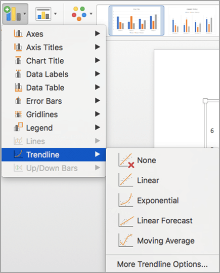 In the chart, choose the data series to add a trendline to, and then select the Chart Design tab.Â