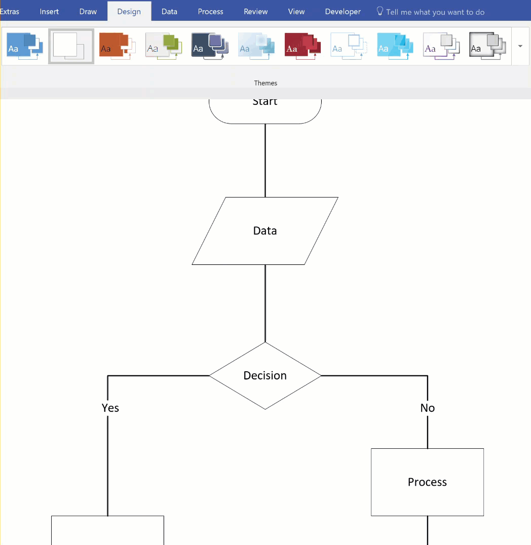 While the default appearance of connectors may be simple lines, they may be designed to work with themes that adds embellishments, such as arrow heads. The built-in themes can be applied from the Themes gallery in the Design tab. To change an attributes of a connector, such as style, color, weight, etc., see Editing Connector Shapes.