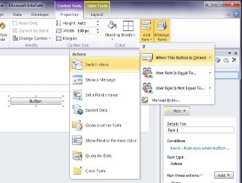 Views are often designed to work with rules. Rules enable you to automate certain tasks in response to events or actions initiated by the person filling out the form. For example, you can insert a button on your form and create a rule that switches views when the button is clicked and, after you insert the button on your form, you can associate the rule with the button so that it switches views when a user clicks it.