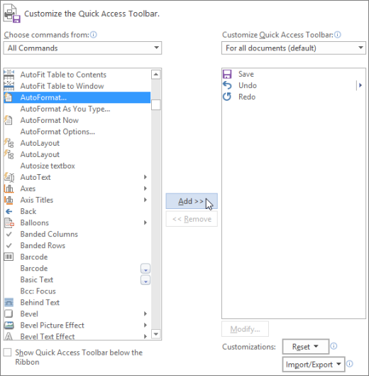 To use the AutoFormat command, first add it to the Quick Access Toolbar, as follows: