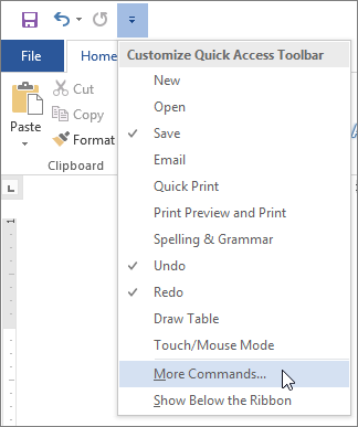 1. In Word, click the Customize Quick Access Toolbar icon, and then click More Commands.
