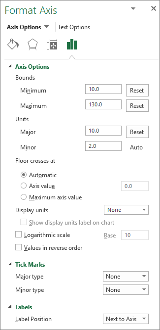 In the Format Axis pane, select Axis Options, and then do one or more of the following: