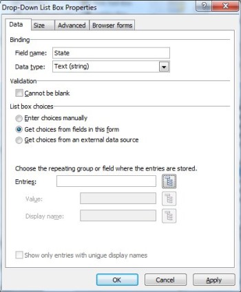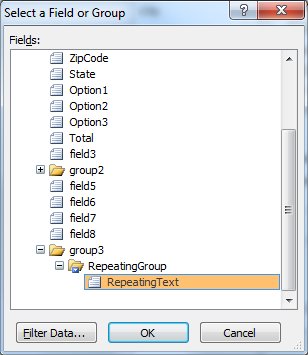 If you base the design of your form template on an external data source, the fields and groups in the Fields task pane are used for that existing data source. In this scenario, you can insert a choice control by dragging a field from the Fields task pane onto the form or by inserting the control as described in the following procedure:
