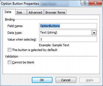 Option buttons are inserted as a group of mutually-exclusive selectable controls that are all visible to the user at a time. For example, if you have five options that a user can select from, and all choices should be shown to the user without them having to scroll through a list, then use option buttons. The user can then quickly scan through the choices available to them and select only one choice from the options.
