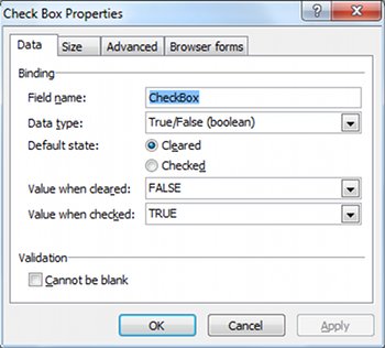 By default, check boxes are set to a Boolean (true/false) data type and the default state is clear (false). You can, however, set them to return a different value, based on their state, when a user fills out the form. For example, if you are preparing the form to send to a group of users to ask about food allergies, a check box can be associated with the question, Allergic to shellfish? Instead of receiving a true/false response, when you get the form back, you can set the data type to Text, and the clear value to Not allergic to shellfish, while the selected value is Allergic to shellfish.