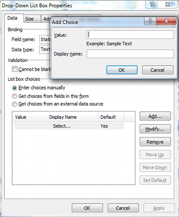 By default, Select appears as the first entry in a drop-down list box. This lets users know that they can make a selection. After inserting a drop-down list box, you must specify the choices that appear in the control, either manually or by retrieving them from a data connection.