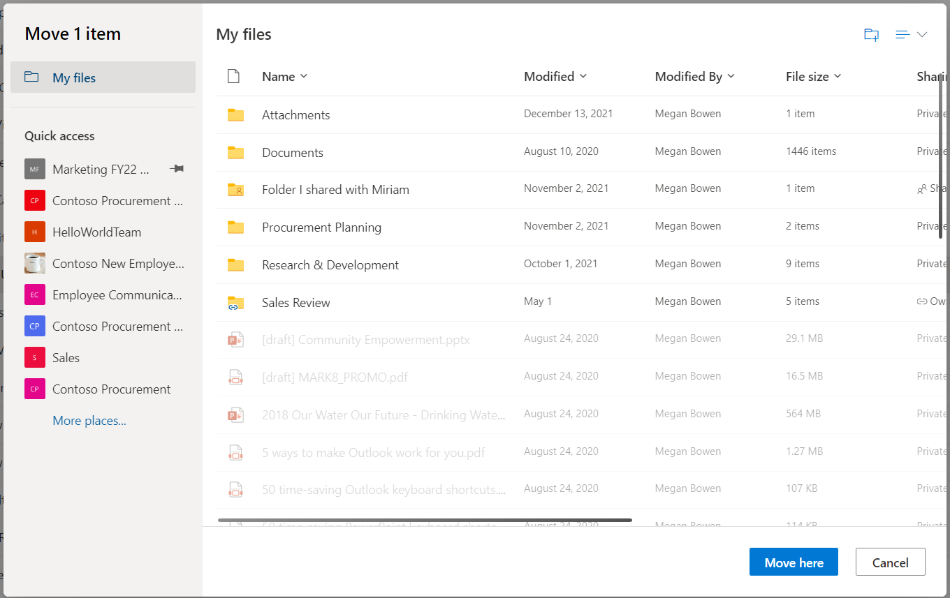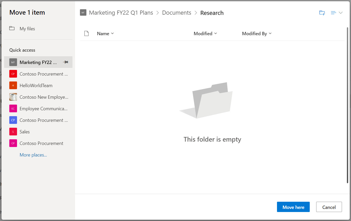 Select the location where you want the items to go, then select Move here to start moving the items.