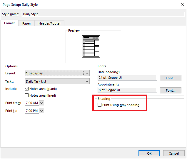 Click Print Options, and then click the Page Setup button under Print style.