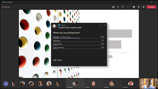Note: Anyone (whether internally within your organization or those external to your organization) that has been forwarded your meeting invitation and is logged into Teams on the web can vote using either the poll notification pop up during the meeting or in the Chat window. We're slowly rolling out the poll notification pop up for all meeting guests. Polls can always be accessed in the Chat window during a meeting.