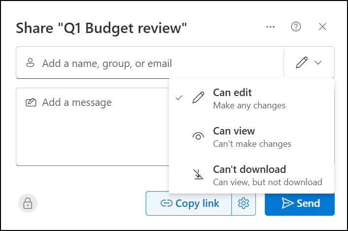 Can Edit and choose the level you want. Can edit is the default. Choose Can view to give permission to view the file, but not edit it. Or pick Can't download to allow the file to be viewed, but not downloaded. -