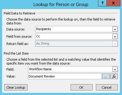 This lookup states, "From the Recipients list, select the value of the Cc field where the Workflow Name equals Document Review."