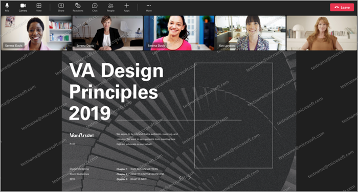 When you apply a watermark, participants will see their own email address overlaid across shared content in the meeting window. This deters people from taking unauthorized screenshots of shared content.