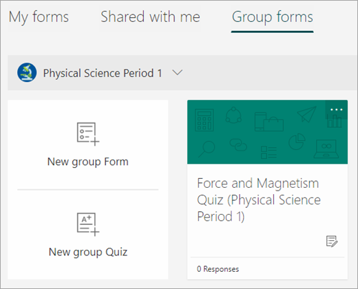 A copy of that Form then saves to http://forms.office.com under the Group forms tab. Select the class where you assigned the quiz, and you'll see your Form.