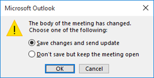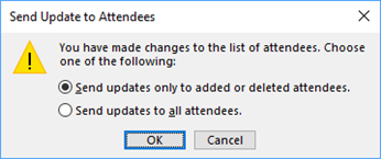 When adding users to a meeting, you do not get the prompt below to send updates only to added or deleted attendees. This may happen even if you didn’t intentionally make changes to the body of the meeting.
