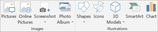 To add a picture to a slide that does not already have a multimedia/photo box, select Insert, then Pictures for a local picture, or Online Pictures for pictures from OneDrive, Bing, or other sources.