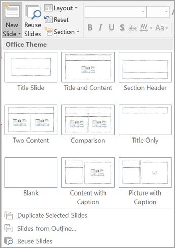 To reuse a slide from this slideshow—or any slideshow you’ve made in PowerPoint before—select Reuse Slides to browse your recent slideshows and find the slide you need.